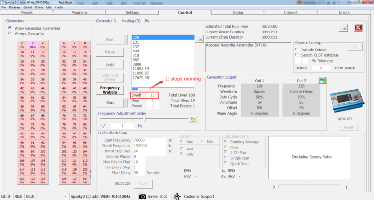 For example, when you find a frequency very effective during treatment, and you want to hit it very hard, then you use the wobble button to make the frequency to hit either side and wobble around the current frequency. And by design, the program would stop progressing, and the button would also change to red.